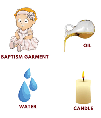 4. ในพิธีรับศีลล้างบาปมีเครื่องหมายสำคัญหรือองค์ประกอบอะไรบ้าง มีใครได้วาดลงไปในรูปหรือไม่ (ให้ผู้เรียนช่วยกันตอบ มีน้ำ, เทียน, เสื้อขาวและน้ำมันคริสมา)