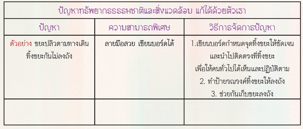ข. กิจกรรม ปัญหาทรัพยากรธรรมชาติและสิ่งแวดล้อม แก้ได้ด้วยตัวเรา” ทำในสมุดประจำตัว