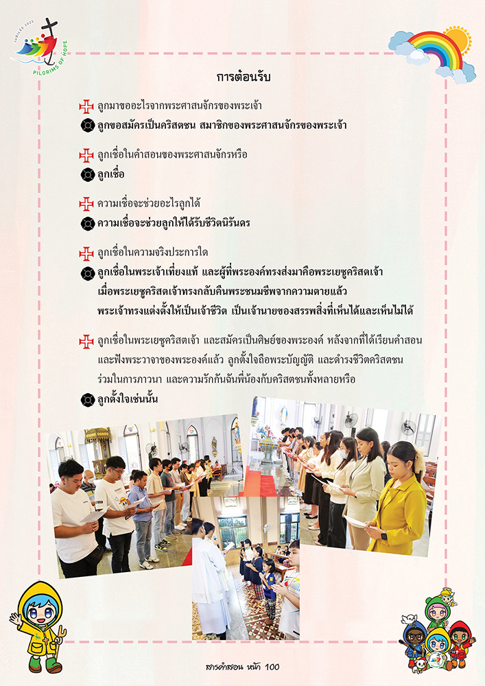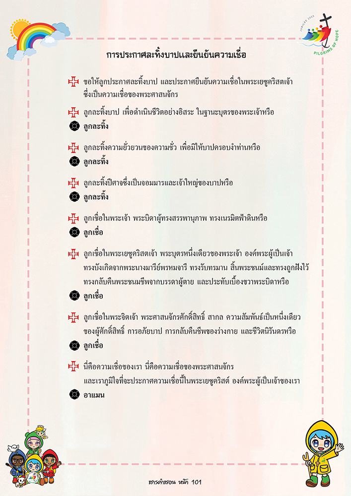 2. ผู้สอนจัดพิมพ์บทการต้อนรับ การประกาศละทิ้งบาปและยืนยันความเชื่อ มาให้ผู้เรียนตามจำนวน เพื่อจะสามารถตอบรับได้ถูกต้อง